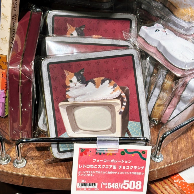 - Details: Crunchy corn puffs coated in rich milk chocolate. The tin comes in two designs: "TV Type" and "Window Type." Priced under 600 yen, its high-quality cat design makes it popular for decoration.