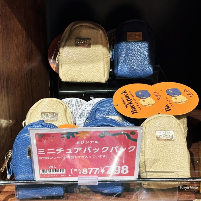 - Details: A soft fabric backpack-shaped pouch rather than a metal tin. It contains bitter coffee-flavored crunch chocolates—a Kaldi specialty. The shoulder strap detail makes it perfect as a bag keychain or a gift for children.